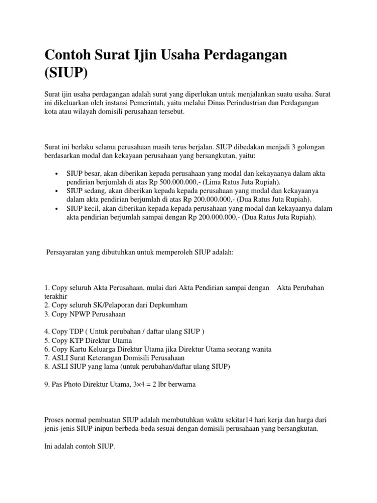 Kalau kamu adalah seorang pemilik bisnis, ada baiknya kamu pun. Pembuatan siup menerapkan tiga kategori berdasarkan modal awal, yakni siup besar dengan modal di atas 500 juta rupiah, siup sedang dengan modal awal antara 200 hingga 500 juta rupiah, serta siup kecil dengan modal awal kurang dari atau sama. #1 surat izin usaha perdagangan (siup). Surat izin usaha perdagangan yang disingkat siup adaleh surat izin wan pemenniah no.36 tahun 1977 (dn no.3095 hal. Permintaan surat izin usaha pengolahan minyak bumi.