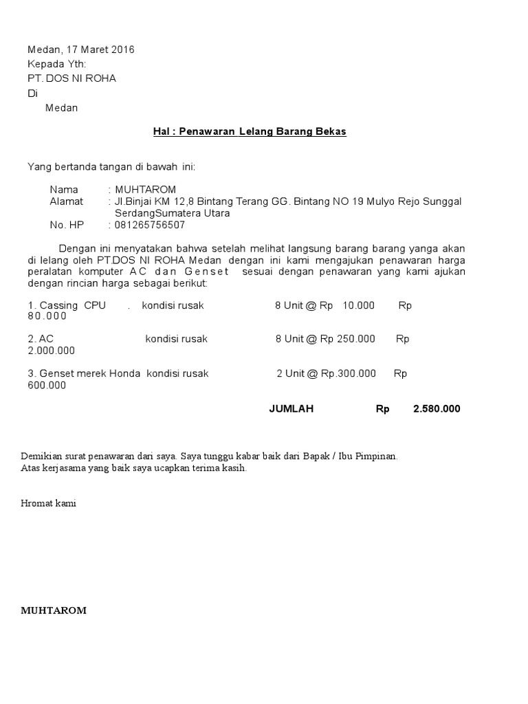 Penawaran Pembelian Besi Tua from imgv2-1-f.scribdassets.com Berikut ini contoh surat penawaran barang yang diterbitkan oleh perusahaan dengan tujuan menjain kerjasama yang saling menguntungkan. Ketika anda ingin membeli barang tertentu, maka tentu anda ingin mengetahui harga barang tersebut terlebih dahulu. Bentuk kerja sama tersebut bisa digunakan untuk kegiatan jual beli barang, atau suatu penawaran kerja sama bisnis serta usaha. Tujuan pembuatannya karena terdapat suatu permintaan baik dari calon konsumen maupun produsen. Surat penawaran yang berkualitas akan membaca kepada kerjasama bisnis yang berkualitas pula. Pada umumnya, surat penawaran memang digunakan oleh pihak perusahaan. Berikut ini terdapat contoh surat penawaran harga barang yang bisa anda jadikan sebagai bahan referensi untuk menunjang aktivitas bisnis anda Contoh surat penawaran barang dan jasa dan tips pembuatannya.