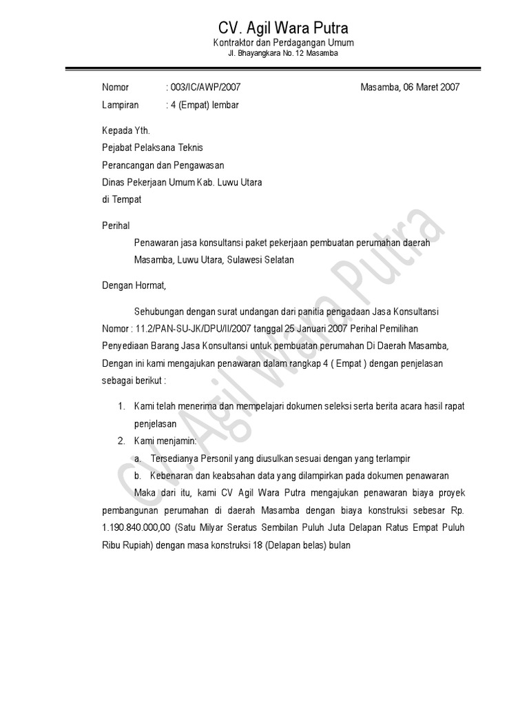 Documents similar to contoh surat penawaran harga untuk lelang. Jika anda merasakan kalau harga yang ditawarkan cocok, barulah kemudian anda bisa mengirimkan surat pesanan barang yang. Apa itu surat penawaran barang? Berikut ini cara membuat surat penawaran yang disertai dengan contoh surat penawaran harga produk / barang, jasa atau kerjasama. Pemasangan instalasi baru dalam gedung dan rumah sakit mutiara bunda. Masa berlakunya surat penawaran ini adalah selama 60 (enam puluh) hari kalender, sejak tanggal surat penawaran. Untuk itu, anda bisa menawarkan barang kepada 8. Contoh surat penawaran harga negosiasi. Sebuah surat penawaran barang dibuat dalam bentuk surat formal yang di dalamnya tertera dengan jelas penjelasan mengenai barang atau jasa yang sedang ditawarkan beserta rincian harganya. Mulai dari surat penawaran kerjasama, barang, produk, jasa contoh surat penawaran banyak sekali, sehingga anda bisa menyesuaikan dengan bidang pekerjaan anda. Sehingga harga menjadi hal yang perlu dicantumkan dalam surat penawaran. Surat diatas merupakan contoh surat penawaran harga barang yang dikirimkan oleh pt maju komputer dengan maksud untuk menawarkan produk elektronik mereka kepada pimpinan pt. Berikut ini contoh surat penawaran barang yang diterbitkan oleh perusahaan dengan tujuan menjain kerjasama yang saling menguntungkan.