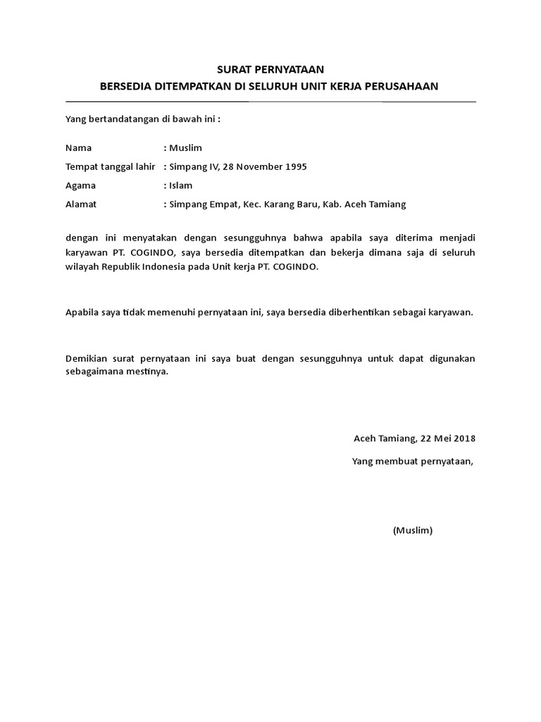 Surat ini biasanya berisi beberapa hal yang mencakup kesanggupan berkaitan dengan bekerja lembur, bersedia dikontrak selama beberapa waktu. Contoh surat pernyataan ( bersedia tidak pindah ). Use the download button below or simple online reader. Atau mungkin memerlukan suatu rekomendasi terlampir dari pihak tertentu juga perlu surat pernyataan. Surat pernyataan adalah surat penjelasan yang menyatakan diri dengan lengkap untuk suatu kondisi yang sebenarnya ✓ yuk simak contohnya. Share this tidak pernah dipecat ataupun diberhentikan dengan hormat dari jabatan di bumn, tni/polri, ataupun sekolah ikatan surat pernyataan bersedia ditempatkan dimana saja. Contoh surat pernyataan bersedia ditempatkan di mana saja. Anda sedang membuka postingan contoh surat pernyataan bersedia ditempatkan dimana saja yang berada pada kategori contoh surat dengan tag pictures gallery of contoh surat pernyataan bersedia ditempatkan dimana saja. Contoh surat pernyataan terbaru dilengkapi dengan contoh terbaru dan cara membuatnya. Demikian ulasan tentang contoh surat pernyataan bersedia ditempatkan dimana saja. Surat pernyataan adalah sebuah surat yang dibuat oleh salah satu pihak sebagai bagian dari pernyataannya karena telah melakukan suatu tindakan dimana tindakan itu berhubungan dengan pihak lain. Tidak pernah diberhentikan dengan hormat sebagai pns, anggota tni / polri, pegawai bumn. This image is provided only for personal use.